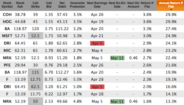If we plug those 18 stocks into Born To Sell's screener and look for weekly covered calls for the Mar 11 expiration, we find several offering 32% annualized returns for a 10 day trade. Also, there is no earnings risk before Mar 11: